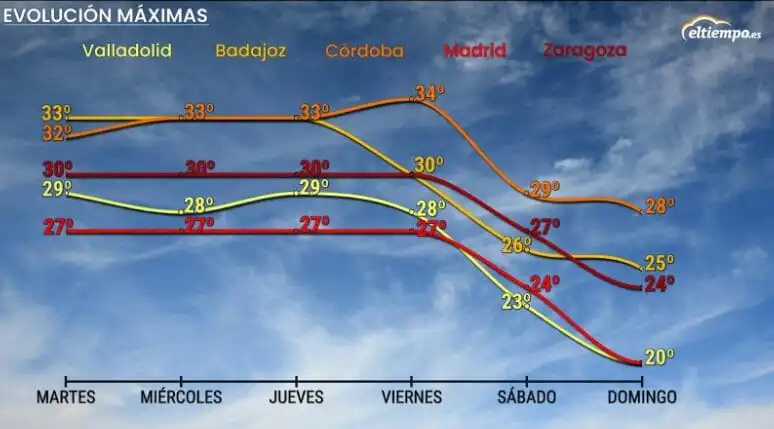 A nivel nacional, se espera que las temperaturas máximas aumenten en el oeste de Galicia y Extremadura, mientras que en el resto del país se prevé un descenso generalizado, que podría ser notable en algunas zonas del interior del este peninsular. Las mínimas también experimentarán cambios, con un ascenso en el tercio nordeste y descensos en el resto de la Península, manteniendo pocos cambios en las Islas Canarias.